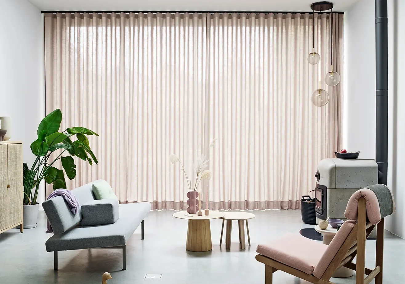 De wave-plooi geeft een strak en symmetrisch effect. De stof hangt in gelijkmatige golven over een speciale rail, wat zorgt voor een rustige en moderne uitstraling. Dit type plooi komt het best tot zijn recht bij soepel vallende stoffen en bij gordijnen die van plafond tot vloer reiken, bijvoorbeeld in een strakke leefruimte of moderne slaapkamer.